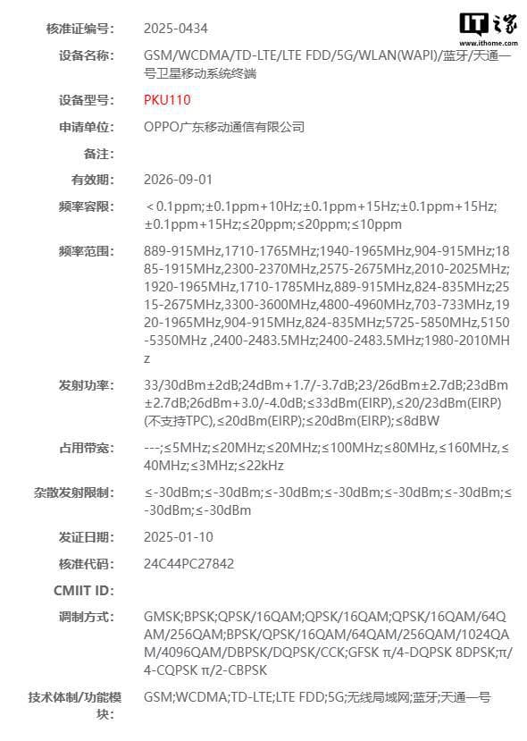 IT之家 1 月 13 日消息,一款型号为PKU110 的 OPPO 手机于 1 月 10 日通过了工信部无线电核准,设备名称包含“天通一号卫星移动系统终端”。
