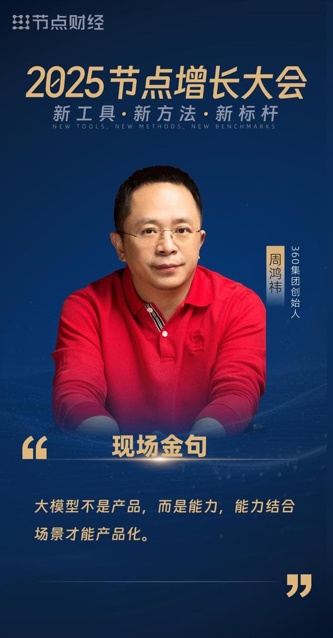 1月10日,由《节点财经》主办的“2025节点增长大会”在北京举行。360集团创始人周鸿祎通过线上方式出席本次大会,分享了对AI大模型时代下的产业创新与变革机会的真知灼见,贡献了一场非常精彩的演讲。