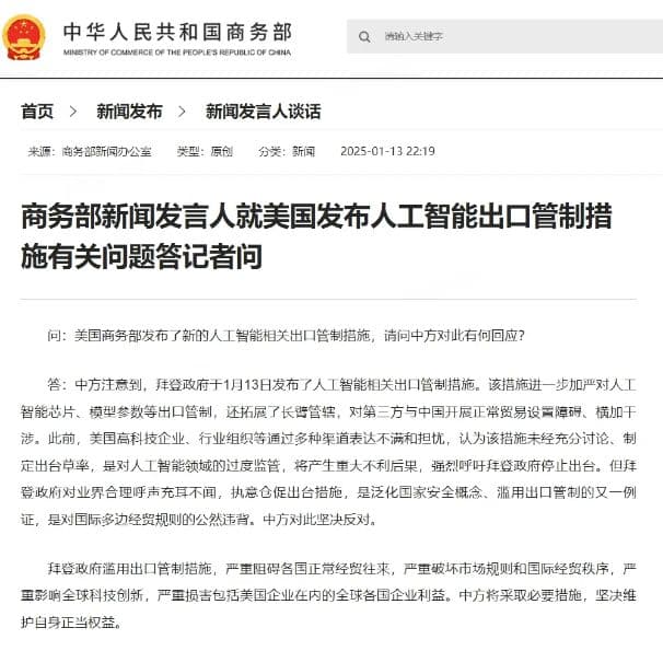 1月14日消息,昨日,拜登政府发布《人工智能扩散临时最终规则》(Interim Final Rule on Artificial Intelligence Diffusion),对AI芯片和技术出口实施严格限制。这是拜登政府在卸任前对全球科技格局的又一次重要干预。