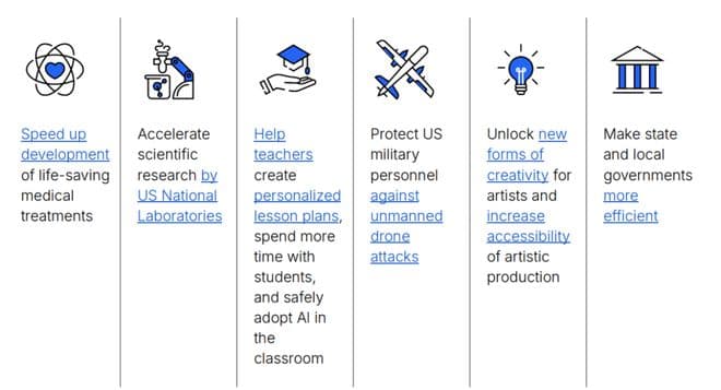 • 加快拯救生命的医疗治疗的研发• 加快美国国家实验室的科学研究• 帮助教师创建个性化课程计划,花更多时间与学生在一起,并在课堂上安全地采用人工智能• 保护美国军事人员免受无人机袭击• 为艺术家解锁新的创意形式,并提高艺术创作的可及性• 使州和地方政府更有效率