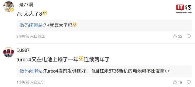 博主在评论区中回复了部分网友的问题:针对新机电池容量越来越大,已突破 7000mAh 的问题,他回复“7K 就算大了吗”,暗示后续机型有望继续突破;针对小米 REDMI Turbo 4 手机电池容量比竞品小的问题,他称“Turbo4 提前发倒还好,而且红米 8735 新机的电池可不比友商小”。