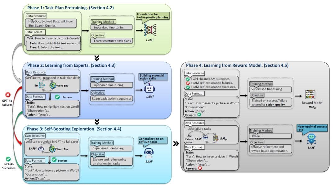 可以看到,训练LAM的过程包括四个步骤:首先,模型学习如何将任务分解为逻辑步骤。其次,通过先进的AI系统(如GPT-4o)学习如何将计划转化为具体行动。然后,LAM会独立探索新的解决方案。最后,通过奖励机制进行微调训练。