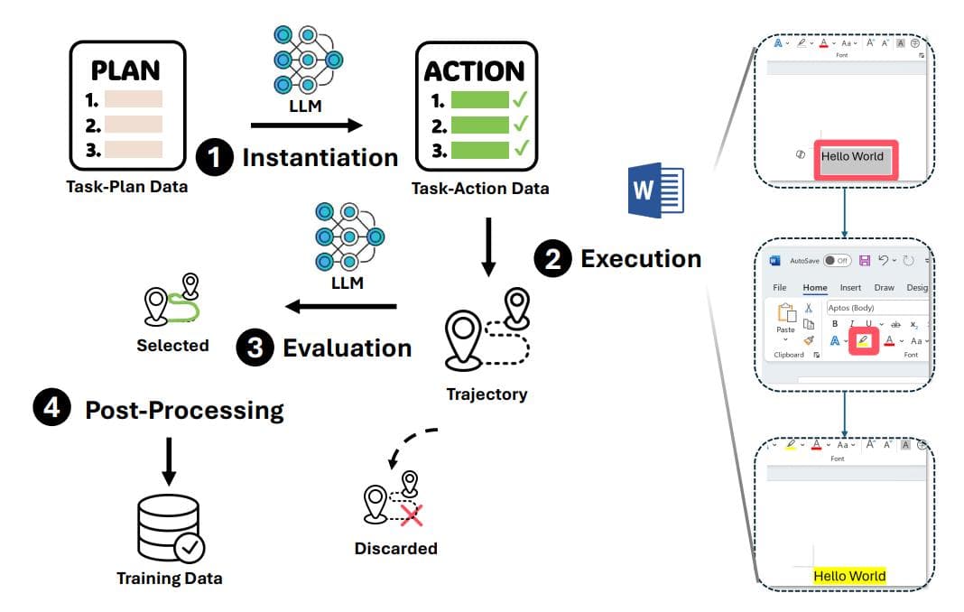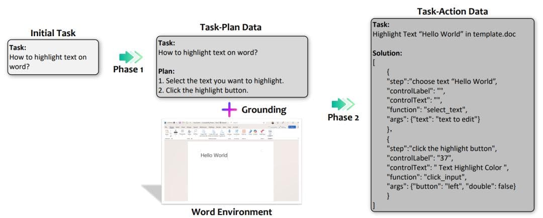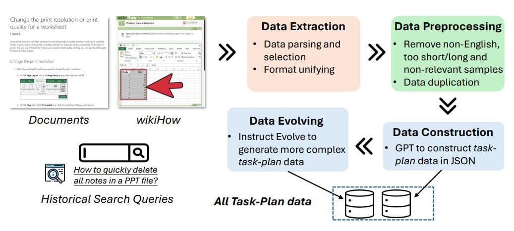 任务是用自然语言表达的用户请求,而计划是为完成这些任务而设计的详细步骤。例如,「如何在Word中更改字体大小?」会有一个对应的计划,概述完成该任务所需的步骤。