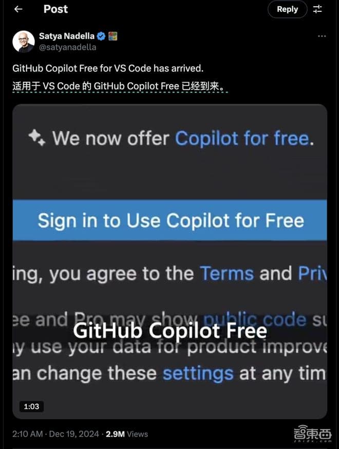感受到竞争威胁的微软,迅速推出GitHub Copilot免费版。免费用户每月可享2000次代码补全。微软CEO Satya Nadella还亲自发推力挺Copilot。