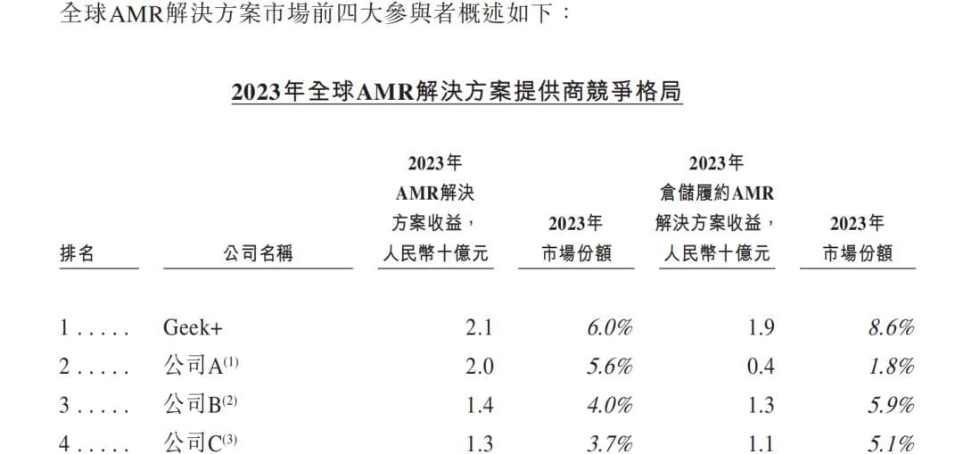 需要注意的是,尽管于2023年全球AMR解決方案提供商中排名第一,但极智嘉6.0%的市场分额仅领先第二名0.4个百分点。