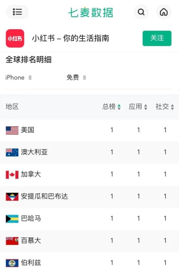 据移动推广数据分析平台七麦数据显示,小红书在海外App Store下载榜上的表现同样抢眼,已成功在87个国家登顶。