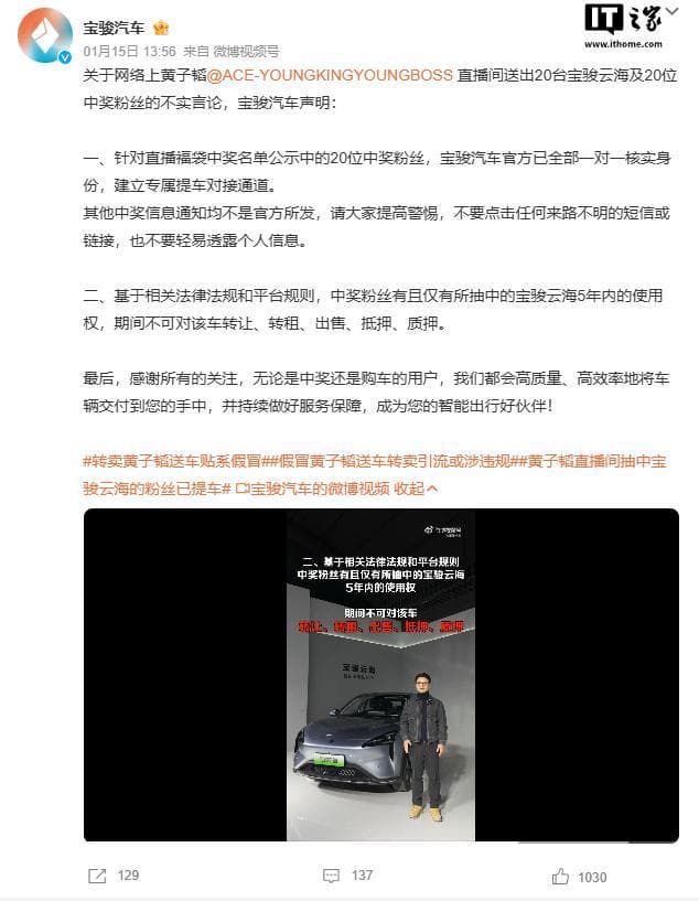 宝骏汽车称其已针对直播福袋中奖名单公示中的 20 位中奖粉丝已全部一对一核实身份,建立专属提车对接通道。