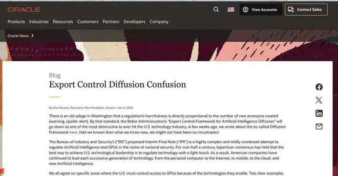 Ken Glueck(肯·格卢克)在博客中批评“最终规则”可能成为美国科技行业历史上最具破坏性的政策之一,“美国国会此前价值2800亿美元《芯片法案》的成果正在付诸东流,这一规则(IFR)将使美国公司的全球芯片市场萎缩80%,拱手让给中国的竞争对手。” 甲骨文称“最终规则”冗长繁琐,将带来巨额合规成本,“会从流程上根本改变全球数据中心部署的经济性。”
