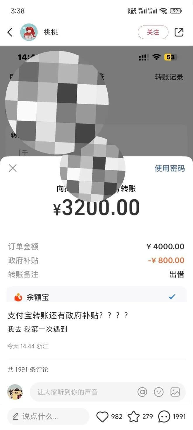也有不少网友晒出了减免的相关截图,包括游戏充值、转账等场景在付款时都显示有政府补贴。(来源:快科技)