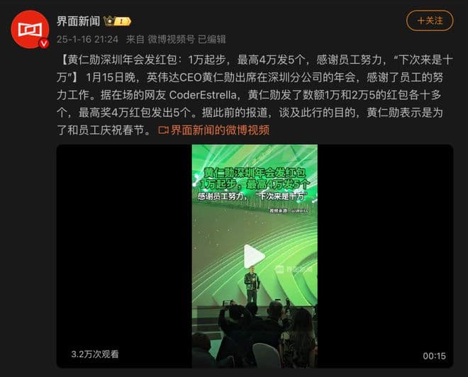 1 月 16 日消息,据界面新闻报道,英伟达 CEO 黄仁勋昨晚出席了在深圳公司的年会,并对员工的努力工作致谢,发放了数额 1 万元、2.5 万元的红包各十余个,还发放了 5 个 4 万元的红包,「下次来是 10 万块!」