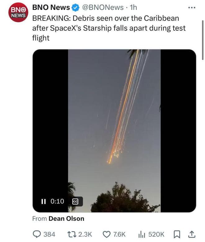 目前尚不清楚飞船是何时以及为何爆炸的。飞船配备了“飞行终止系统”,如果它开始偏离航线,该系统将让飞船解体,目的是确保不对人员或财产构成威胁。但据CNN报道,社交媒体上铺天盖地的帖子称,飞船残骸像雨点一样落在加勒比上空,残骸可能影响飞机飞行。飞机追踪公司Flightradar24在社交媒体上表示,飞船解体地区的飞机正在改道或等待,以避免撞上任何潜在的碎片。