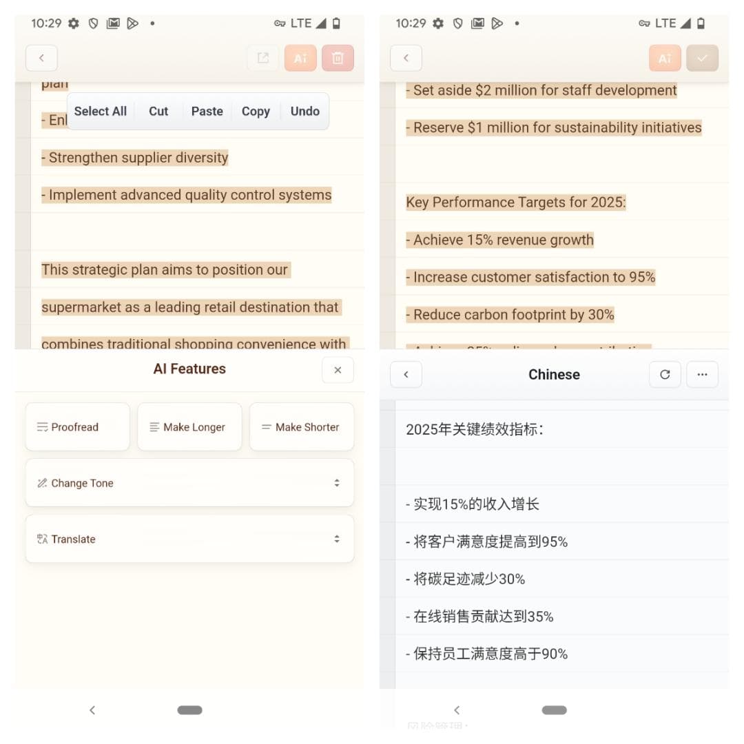 在笔记功能下,可以对选中文字进行校对、扩写、缩写、改写、翻译等处理。
