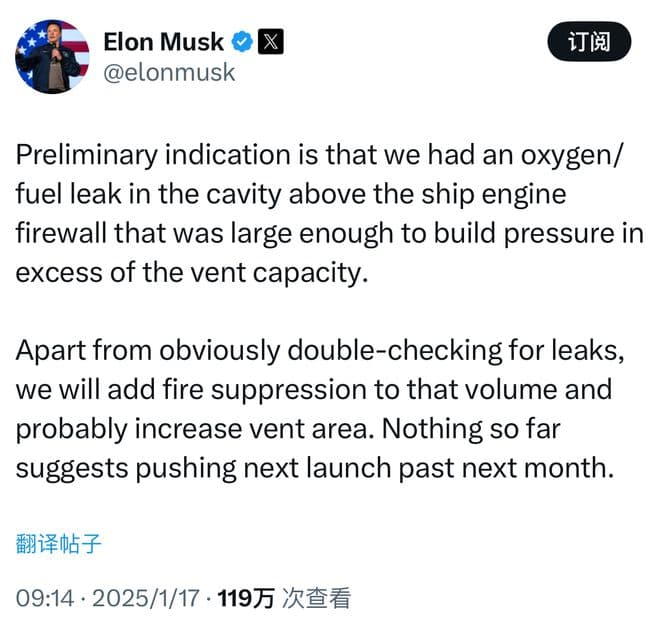 根据马斯克的最新回应,初步迹象表明,飞船发动机防火墙上方的空腔中发生了氧气/燃料泄漏,泄漏量大到足以产生超过通风口容量的压力。“显然,除了需要重新检查泄露状况,我们还会在该区域增加灭火装置,可能还会增加通风面积。”马斯克透露,目前为止,还没有迹象表明下一次发射将推迟到下个月之后。