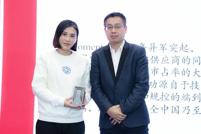 ▲牛车网总编辑赵世超为昊铂新能源灯塔工厂代表张启明颁奖