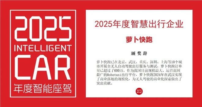 萝卜快跑已在北京、武汉、重庆、深圳、上海等10个城市开展全无人自动驾驶出行服务与测试,萝卜快跑订单量已超过了600万。作为我国目前规模最大、运营范围最广的Robotaxi出行平台,萝卜快跑2024年在武汉实现了商业落地的规模化,为无人驾驶的商业化探索做出了突出贡献。
