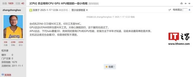 IT之家 1 月 17 日消息,Chiphell 论坛消息人士 zhangzhonghao 今日中午分享了有关 AMD 明年新品规划的“一些小传闻”。