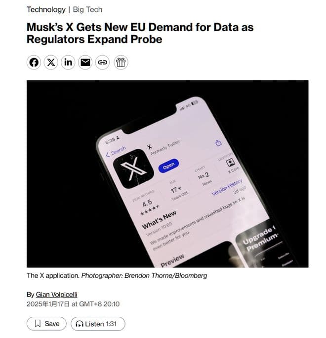 IT之家 1 月 17 日消息,据彭博社报道,欧盟扩大了对埃隆・马斯克旗下社交平台 X 的调查,关注该平台是否违反了欧盟的内容监管规定,并要求其提供内部数据。