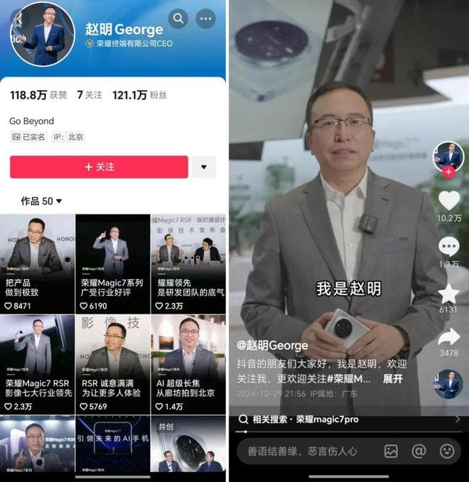 开始做短视频,或许是因为荣耀手机销量在2024年再度承压,他需要寻找新的突破方式,比如效仿雷军做个人IP。2024年10月30日的荣耀Magic7发布会上,赵明在现场展示AI功能,通过手机YOYO助理成功下单2000杯瑞幸奶茶,送给在场观众,顺利冲上热搜。
