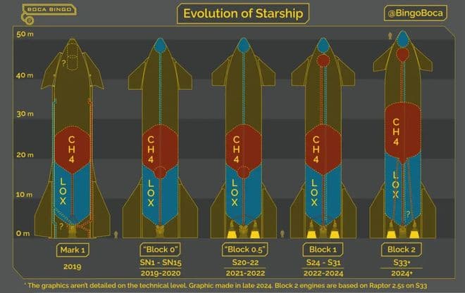 之前几代版本星舰与这次的对比