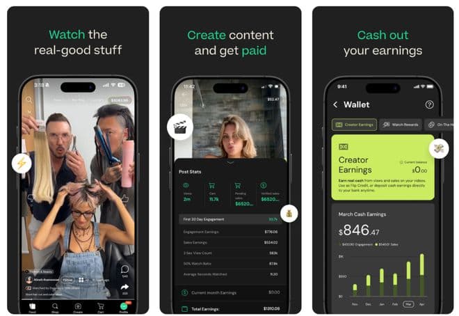 另一款 Flip 发扬光大的则是 TikTok 电商的部分。Flip 本质上是个购物平台,或许可以理解为“购物纯享版的 TikTok”,平台上用户刷到的所有短视频都挂着商品链接,而用户也只有在下单之后才被允许发布视频,理想中这会是一个充满用户真实反馈的社交电商平台,Flip 用发钱激励的方式让这一切完美运行,从发布反馈视频、观看视频到邀请用户都给现金补贴。而拿到融资的 Flip 可能的确也不缺钱,今年 4 月 Flip 刚刚拿到了由 Streamlined Ventures 领投的 1.44 亿美元 C 轮融资,融资总额来到 2.88 亿美元。