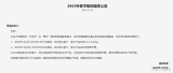 德邦快递:公告显示,为全力保障消费者在“年货节”及“春节”期间的寄递服务需求,将动态调节服务收费。1月3日-1月27日期间,将对部分客户、部分产品加收0.2元-0.5元/kg,1月28日-2月4日期间,将对部分客户、部分产品加收资源调节费。