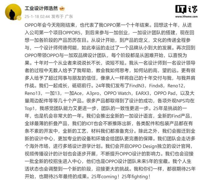 IT之家 1 月 18 日消息,OPPO 工业设计中心总经理、一加首席设计总监刘浩然今日凌晨在微博发长文,回顾了自己在 OPPO“第一个十年”的经历,并披露了后续的规划。