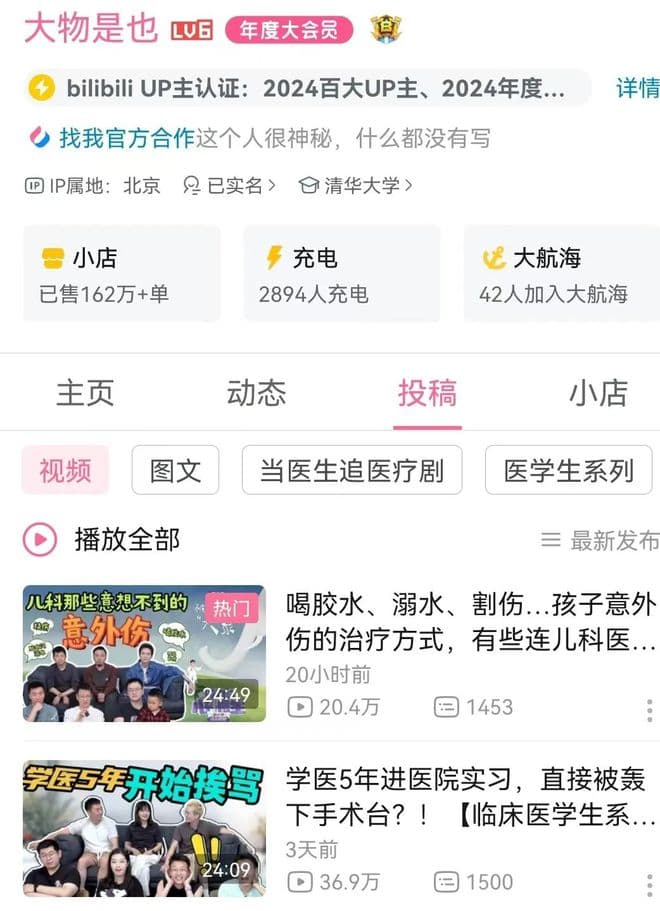 拥有190万粉丝的UP主“大物是也”并非医学科班出身,此前主要发布搞笑视频。入驻B站后,他在一期节目中邀请几位医生朋友做客分享,意外取得不错的效果;随后,《医学生系列》《医生聊天室》《当医生追医疗剧》等系列视频日益火爆,“大物是也”也拿下了抗老护肤品等大健康品牌的营销合作。