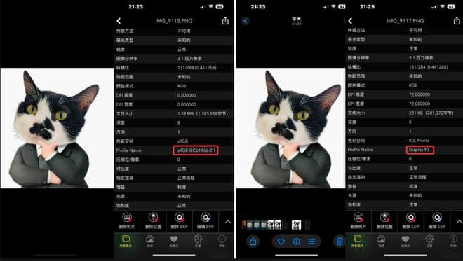 全屏状态下截图,依旧为 sRGB 色域;露出系统 UI 状态下截图,就保存成了 P3 色域