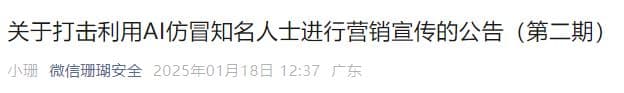 1月18日,“微信珊瑚安全”微信公众号发布“关于打击利用AI仿冒知名人士进行营销宣传的公告(第二期)”。
