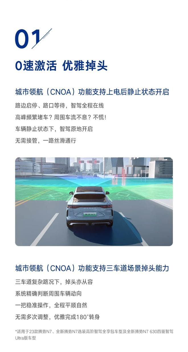 城市领航(CNOA)功能支持上电后静止状态开启城市领航(CNOA)功能支持三车道场景掉头能力适用于 23 款腾势 N7、全新腾势 N7 选装高阶智驾全享包车型及全新腾势 N7 630 四驱智驾 Ultra 版车型