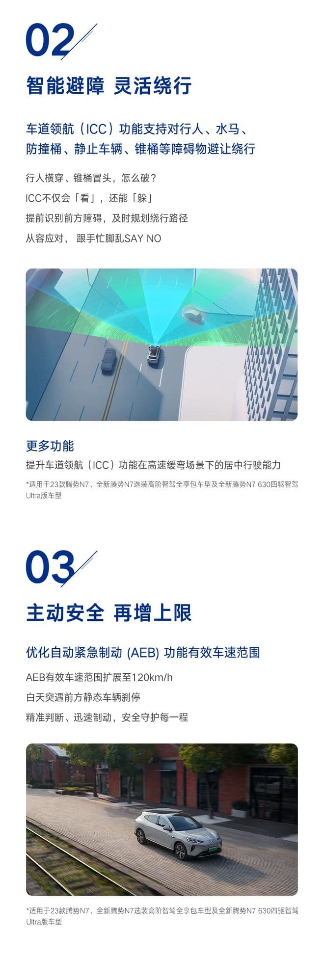 车道领航(ICC)功能支持对行人、水马、防撞桶、静止车辆、锥桶等障碍物避让绕行提升车道领航(ICC)功能在高速缓弯场景下的居中行驶能力适用于 23 款腾势 N7、全新腾势 N7 选装高阶智驾全享包车型及全新腾势 N7 630 四驱智驾 Ultra 版车型