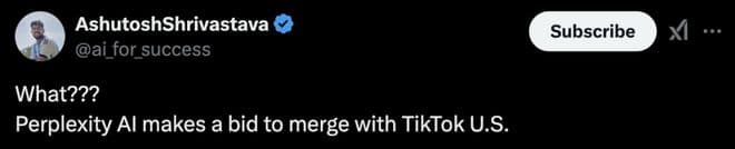 投资者普遍认为,AI辅助搜索很可能改变用户获取信息的方式,这正是Perplexity看中TikTok的重要原因之一。