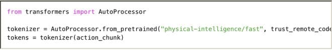 Physical Intelligence 团队表示,他们将发布在 100 万个真实机器人动作序列上训练过的 FAST tokenizer 版本。这样,任何人都可以使用 FAST 训练策略,只需三行代码,就可以把动作 token 化: