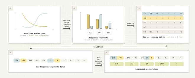 图|FAST tokenizer 使用离散余弦变换(DCT)对动作序列进行压缩,生成了一个密集的压缩动作 token 序列。