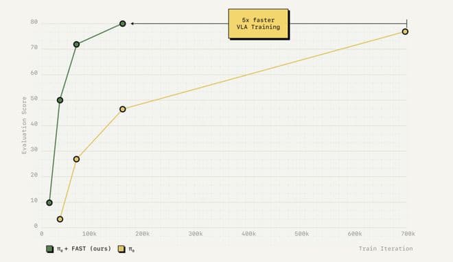 图|使用 FAST 进行训练非常高效。通用策略 π0-FAST 的训练速度比原始的 π0 模型快 5 倍,并取得了相似的性能。