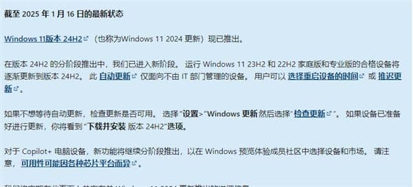 快科技1月19日消息,微软于1月16日更新了支持文档,宣布Windows 11 24H2进入新阶段。