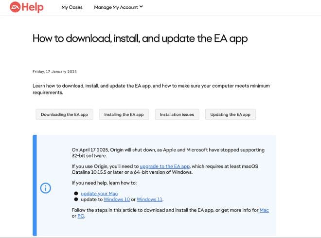 公告显示,EA 将于 2025 年 4 月 17 日停止 Origin 平台的运营,后续将切换至 EA App 平台。EA 表示,其关闭原因是因苹果和微软已停止支持 32 位软件。Origin 平台关闭后,玩家将需要使用 EA App 来启动此前所购买的游戏。