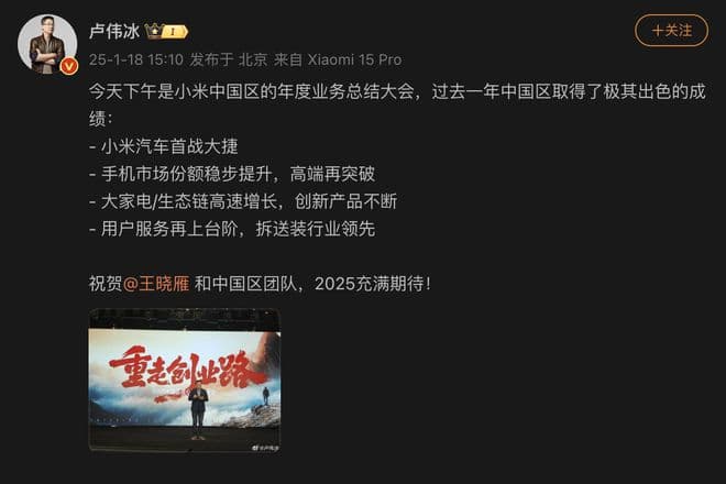近日,小米集团总裁卢伟冰发文表示,过去一年小米在中国区取得了极其出色的成绩。