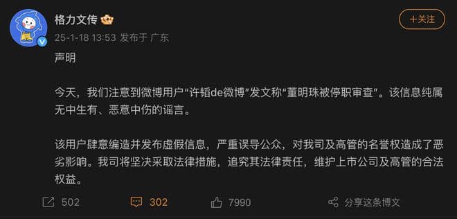 格力文传表示,该传闻由微博用户「许韬 de 微博」发布,同时强调该用户肆意编造并发布虚假信息,严重误导公众,对格力及高管的名誉权造成了恶劣影响。