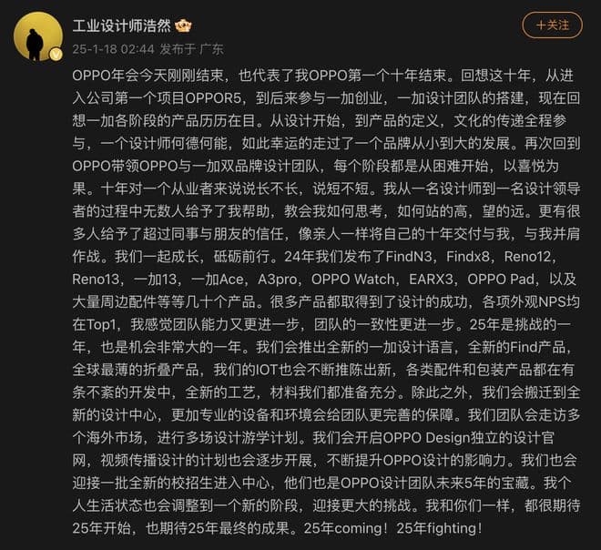 文中,浩然回归了其在 OPPO 的十年经历,讲述了其从入职 OPPO 第一个项目到如今参与一加各阶段的产品设计。随后浩然透露,2025 年会推出全新的一加设计语言,OPPO 也将拥有全新的 Find 产品;此外 OPPO 的 IoT 也会不断推陈出新,各类配件和包装产品都在有条不紊的开发中,全新的工艺,材料 OPPO 都准备充分。