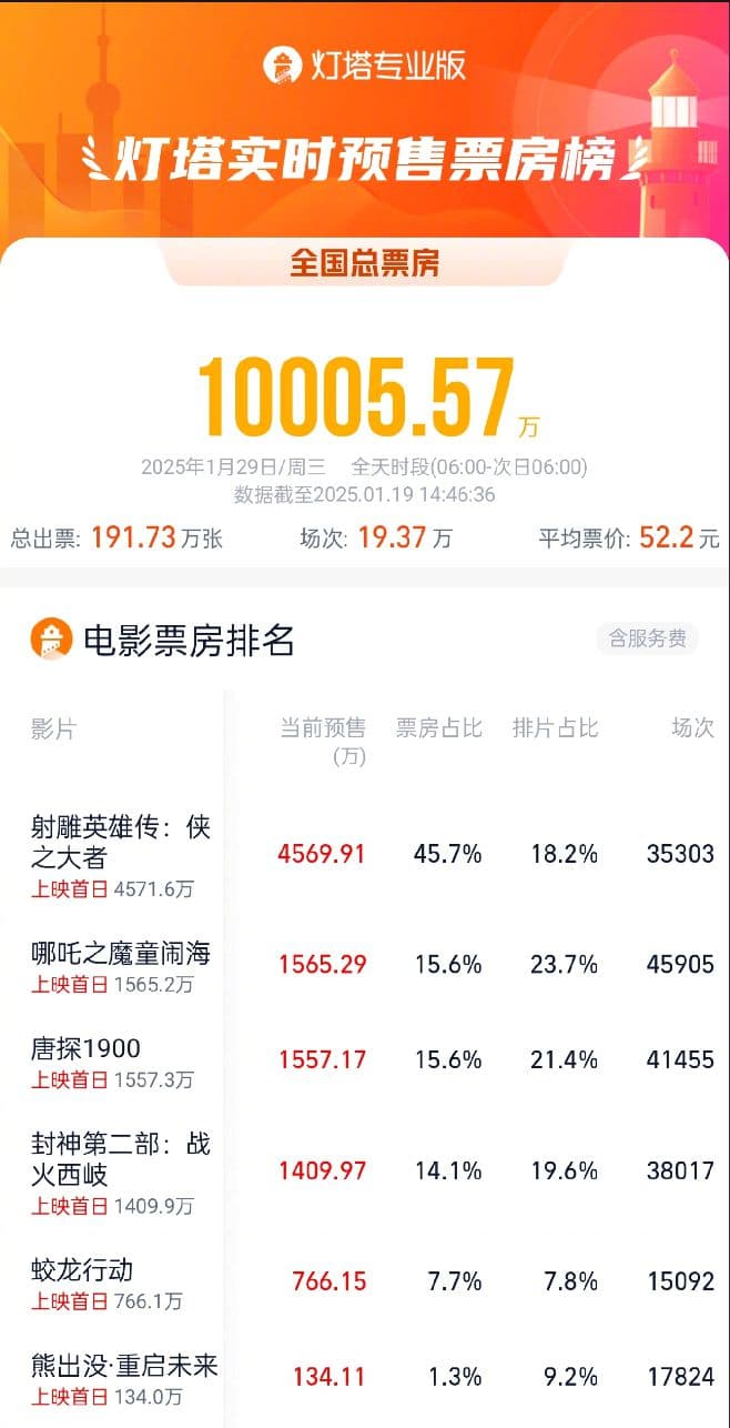 1 月 19 日,据灯塔专业版显示,截至该日 14 时 46 分,2025 年大年初一预售票房突破 1 亿。