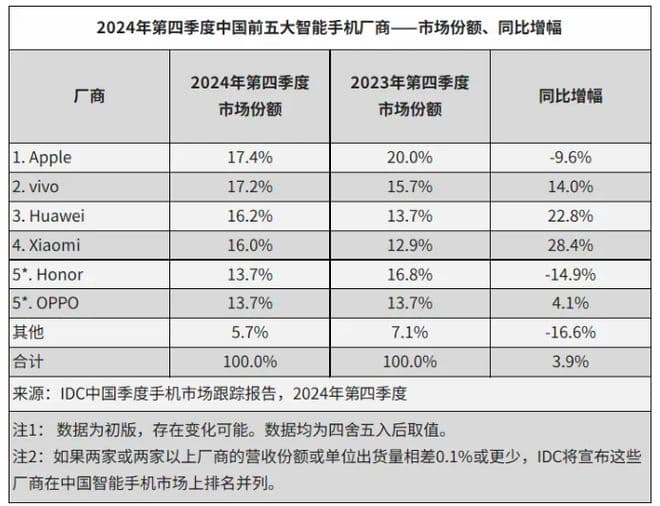 苹果市场份额 17.4%,同比下降 9.6%vivo 市场份额 17.2%,同比增长 14.0%华为市场份额 16.2%,同比增长 22.8%小米市场份额 16.0%,同比增长 28.4%荣耀市场份额 13.7%,同比下降 14.9%OPPO 市场份额 13.7%,同比增长 4.1%