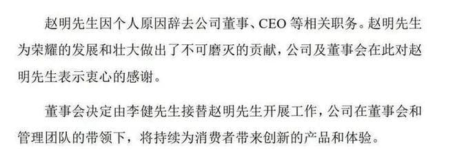 公告肯定了赵明对荣耀做出的贡献,并宣布了董事会新的任命——“赵明先生为荣耀的发展和壮大做出了不可磨灭的贡献,公司及董事会在此对赵明先生表示衷心的感谢。董事会决定由李健先生接替赵明先生开展工作,公司在董事会和管理团队的带领下,将持续为消费者带来创新的产品和体验。”