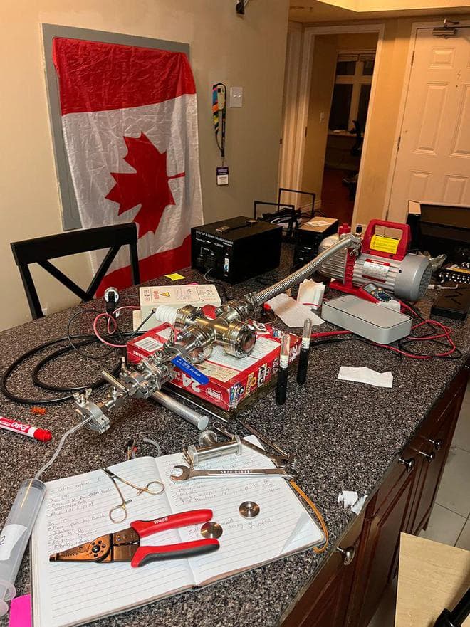 在获得所有部件后,Hudzah 和一位朋友开始工作。他们花了前六个小时组装部件,并确保真空室能够达到 3 毫托的压力。接下来的六个小时里,另一位朋友加入了他们,三人一起实现了生成氘气的所需高压。