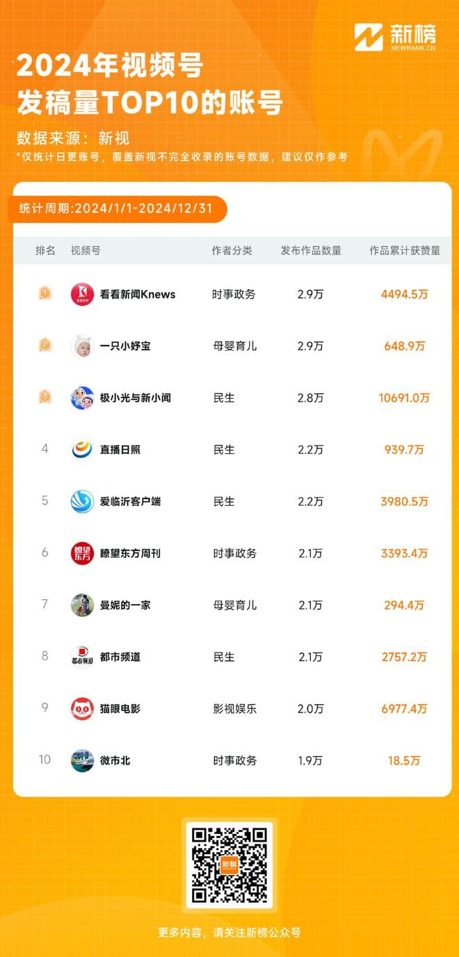 新闻民生类账号同样是视频号的“产粮大户”。通过统计2024年视频号发稿量TOP 10的日更账号,我们发现新闻民生类账号发稿最勤奋,源源不断为视频号提供内容。