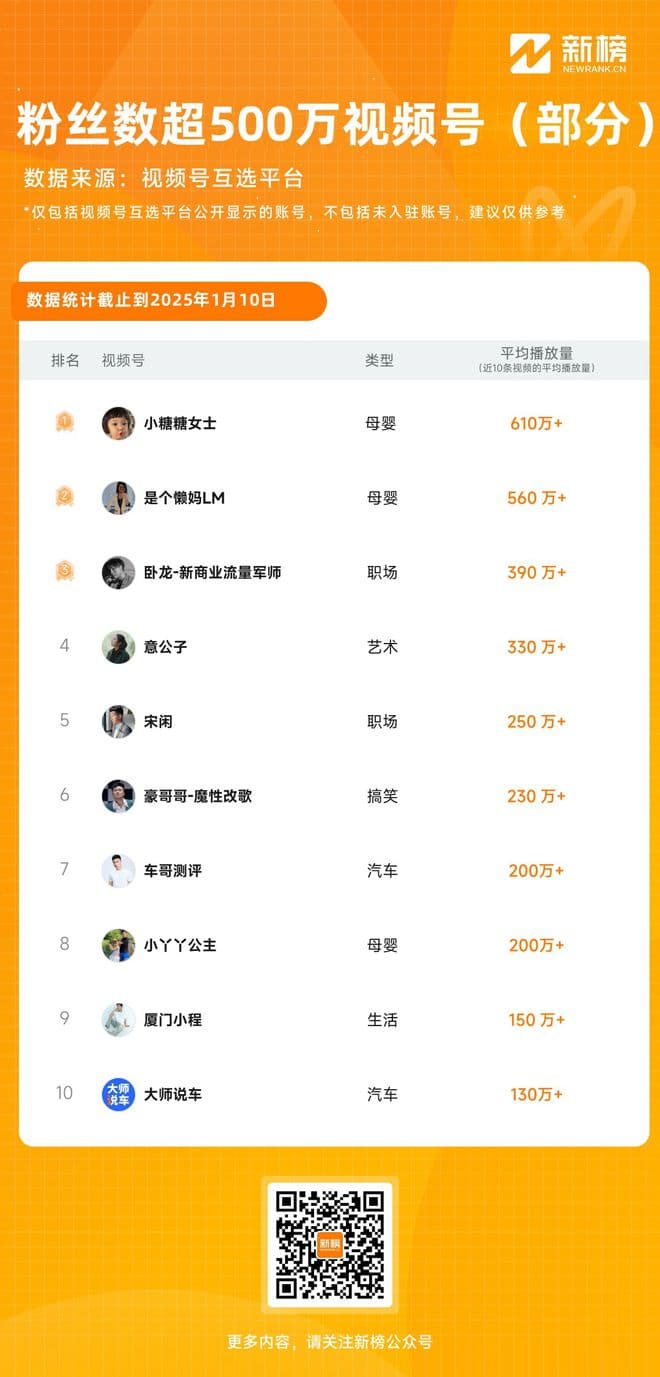 互选平台显示,截至2025年1月10日,视频号至少有1288个账号粉丝量超过100万,有44个账号粉丝量超过500万。