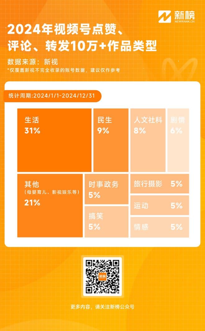 根据新视数据不完全统计,2024全年至少有311条视频号作品点赞、评论、转发量均超过10万。这其中,生活类作品遥遥领先,占比31%,其次是民生、人文社科、剧情等。
