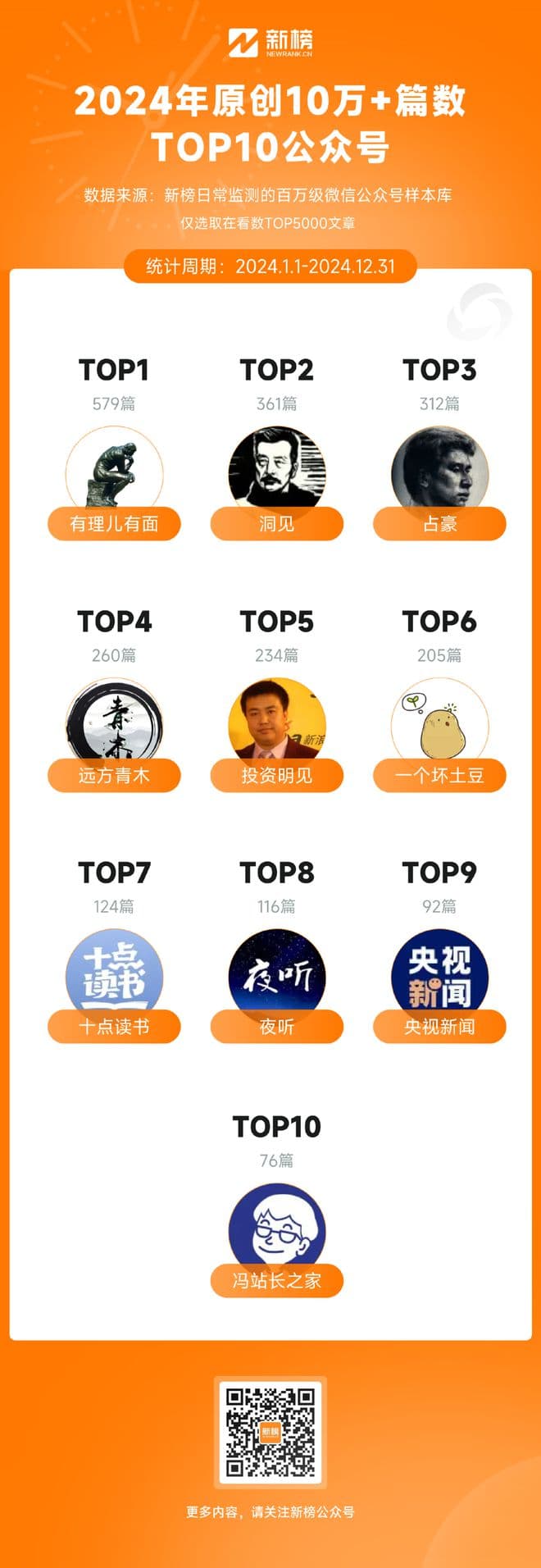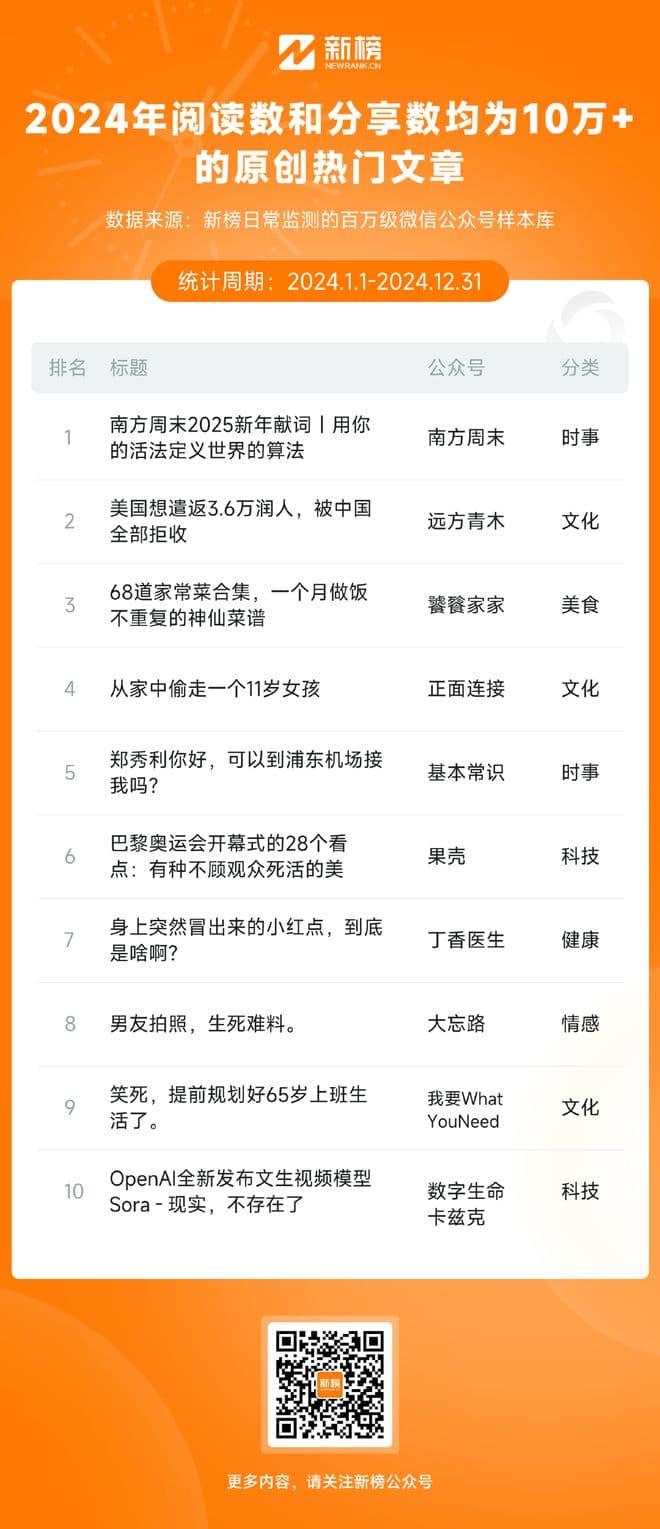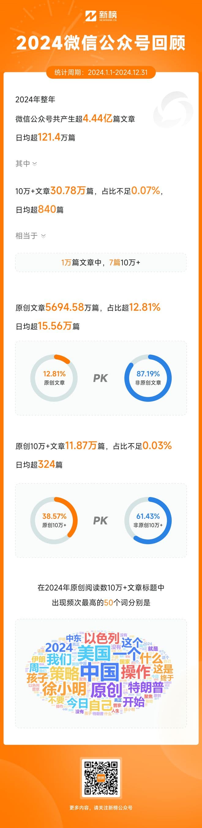 综合原创和阅读量两个维度,2024年公众号日产超324篇原创10万+,全年有11.87万篇原创文章获得10万+,比2023年高出3.9万篇。