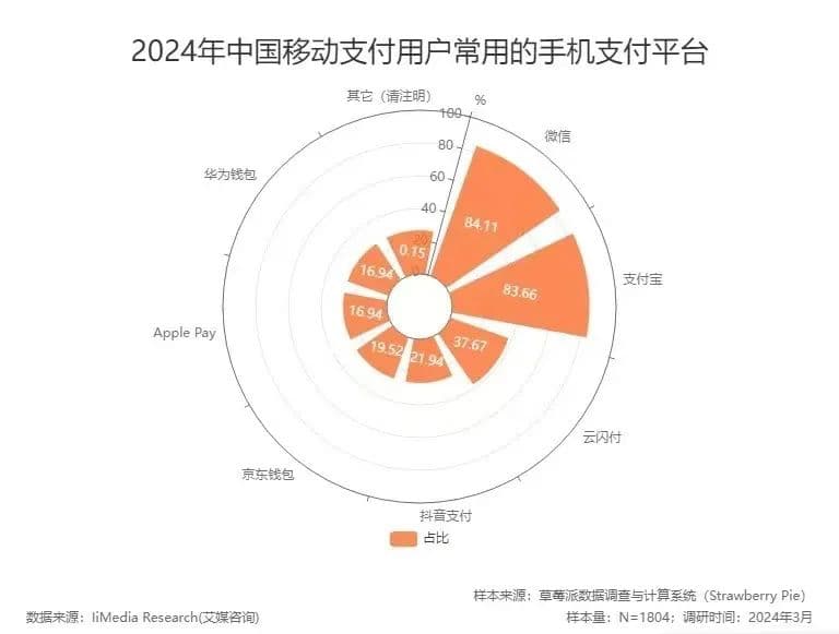 iiMedia Research(艾媒咨询)数据显示,2024年中国移动支付用户常用的手机支付平台中,微信和支付宝位列前二,占比分别为84.11%、83.66%。微信的使用范围更广,而使用支付宝的用户部分原因是海外“AliPay”。