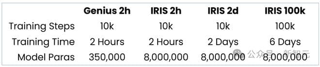 值得注意的是,无论训练时长如何,IRIS训练后的模型包含800万个参数,而Genius仅需35万个参数,模型体积减少了96%。